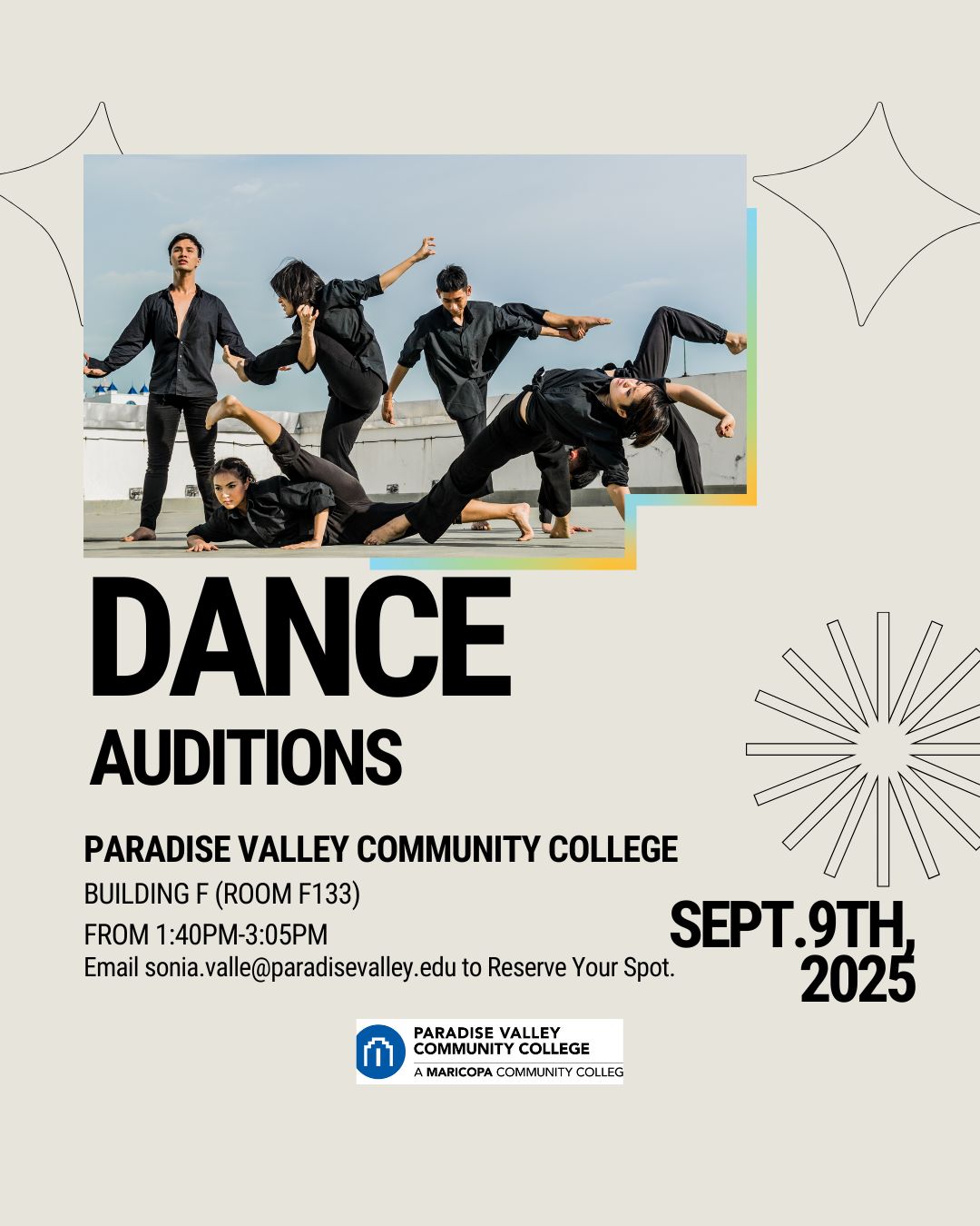Audition to join the Dance Performance class at PVCC! Reserve your spot today! Auditions will be held on Tuesday September 9th, 2025 1:40-3:05pm in F133 (Fitness Center Building) at Paradise Valley Community College, 18401 N. 32nd Street, Phoenix, AZ 85032. For more information email sonia.valle@paradisevalley.edu