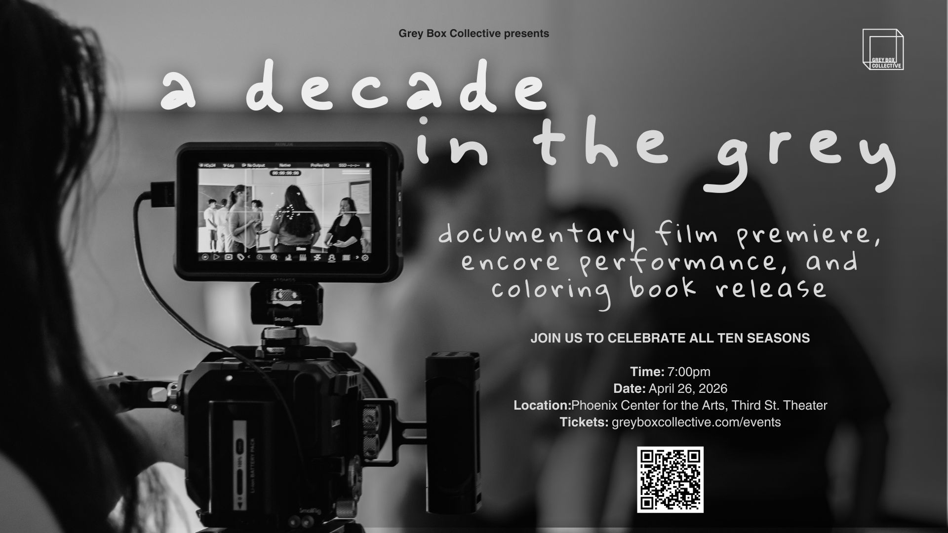 A Decade In The Grey April 26th | 7pm | Third Street Theater, Phoenix Center for the Arts Documentary Film Premiere + Encore Performance + Coloring Book Release This is the moment we've been building toward, a celebration of ten years spent playing in the messy grey areas of life. ...