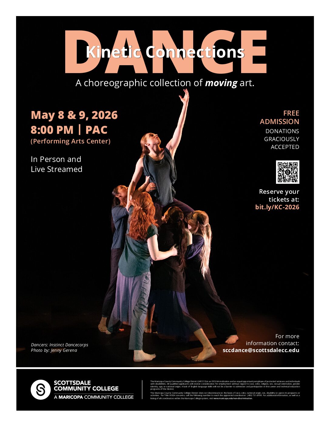 The award-winning Scottsdale Community College Dance Program presents Kinetic Connections, an exciting evening of movement showcasing works by eight choreographers. They will be joined by guests Bodies Contemporary Company and Tareake Dorill Ramos. This all-ages performance will be presented in person and via livestream. Join us for this inspiring biannual ...